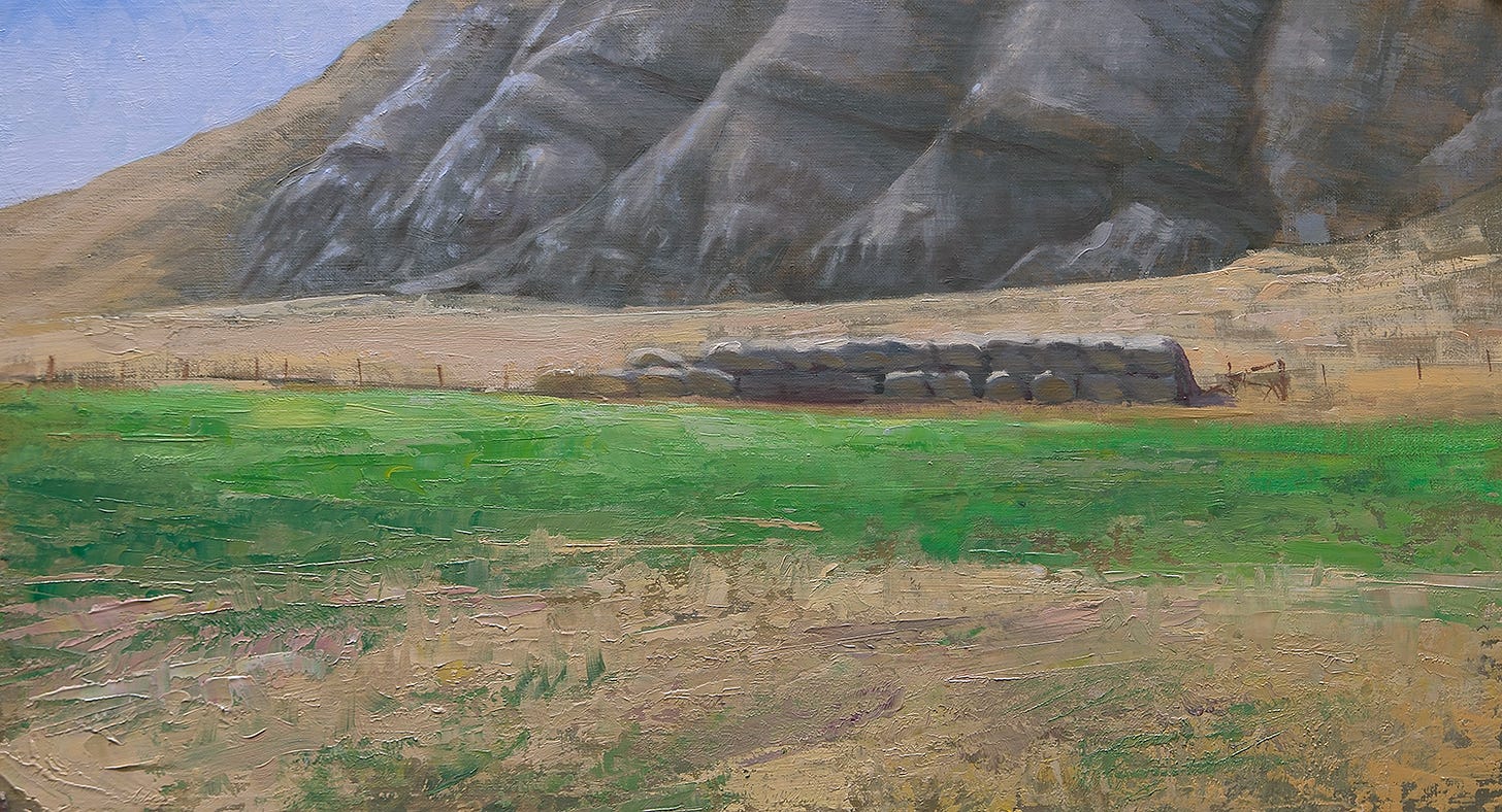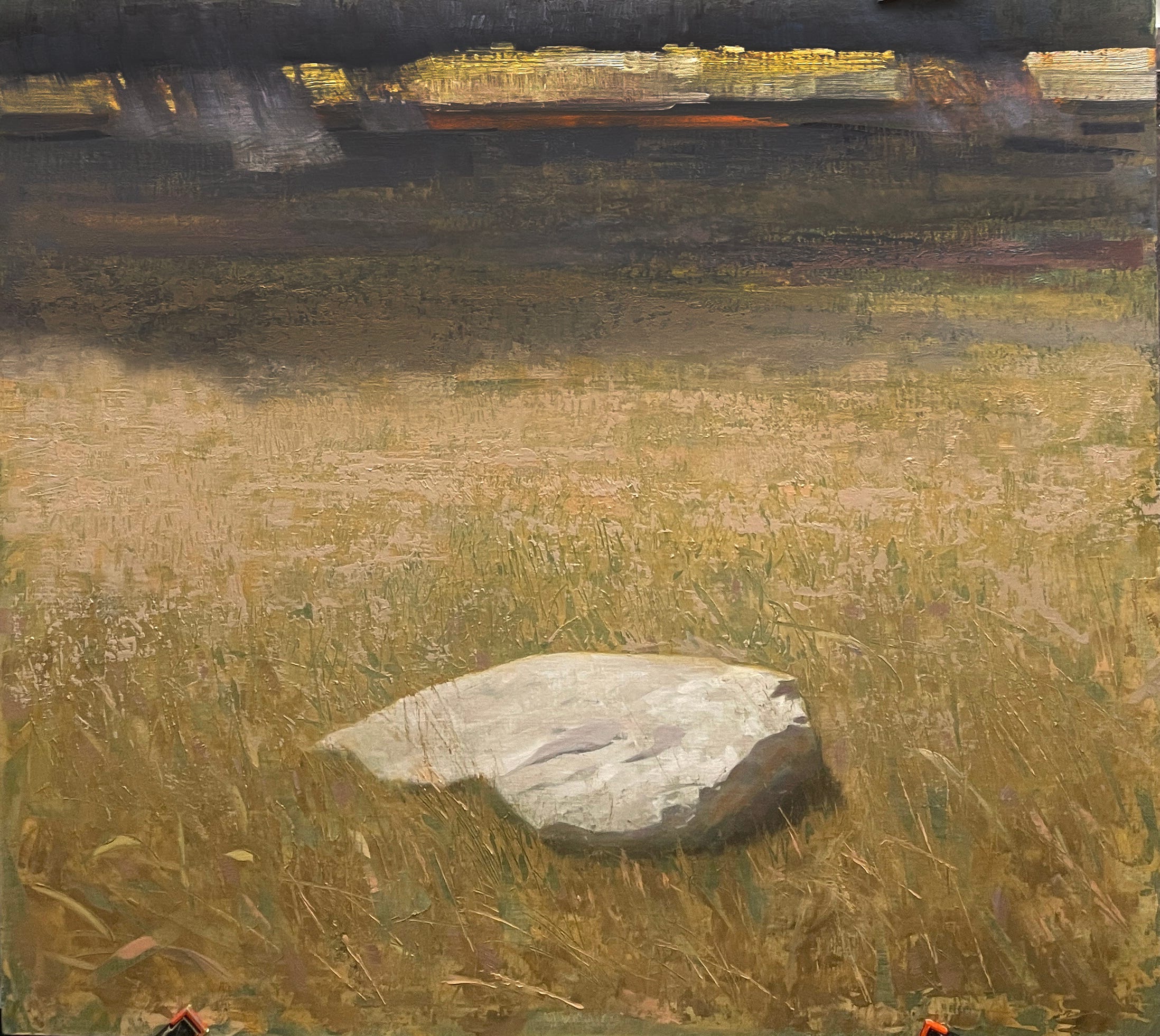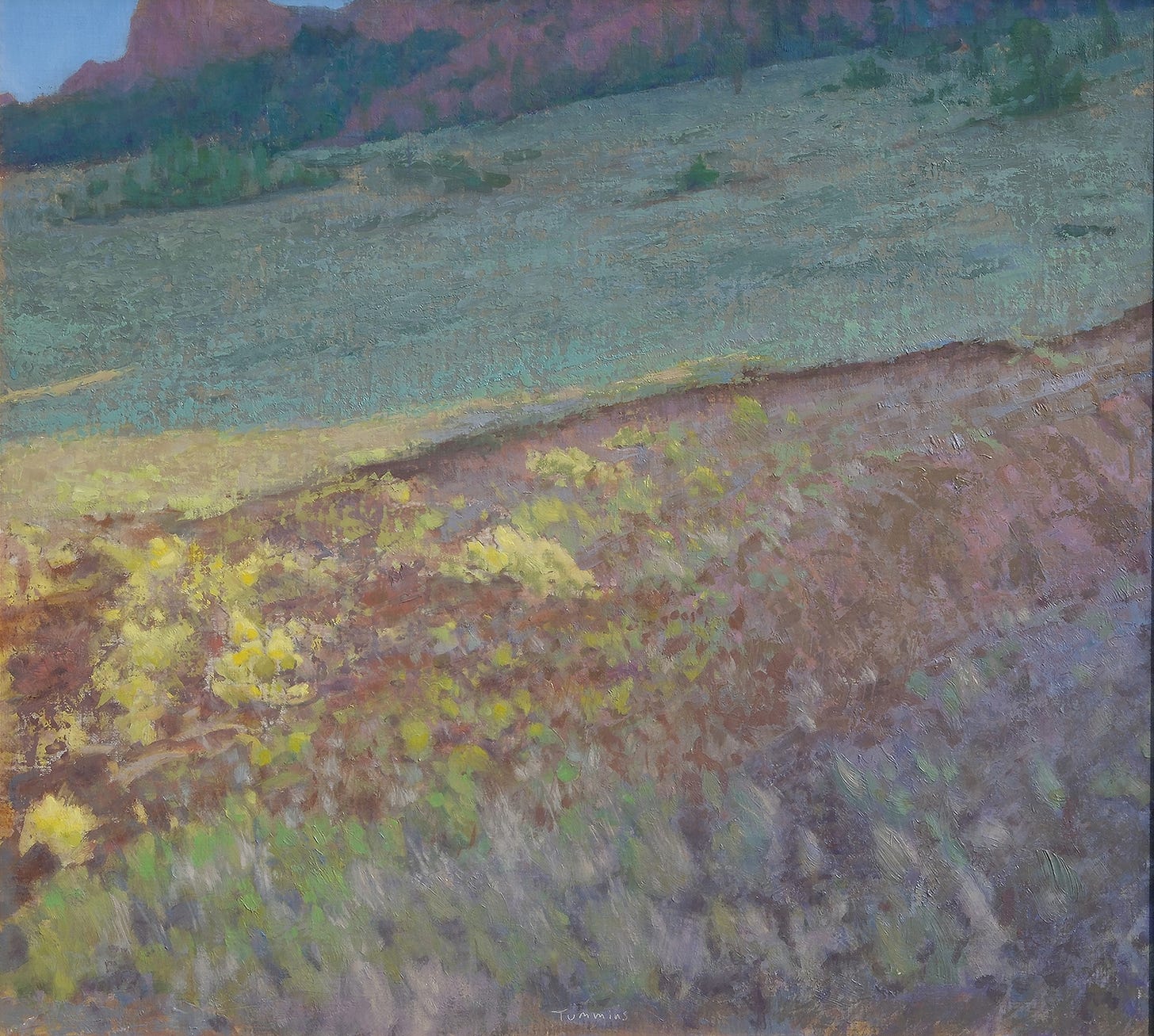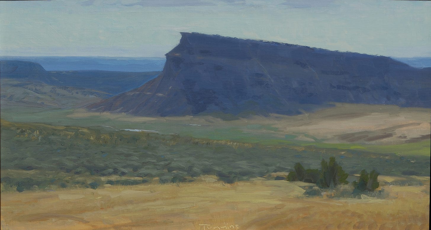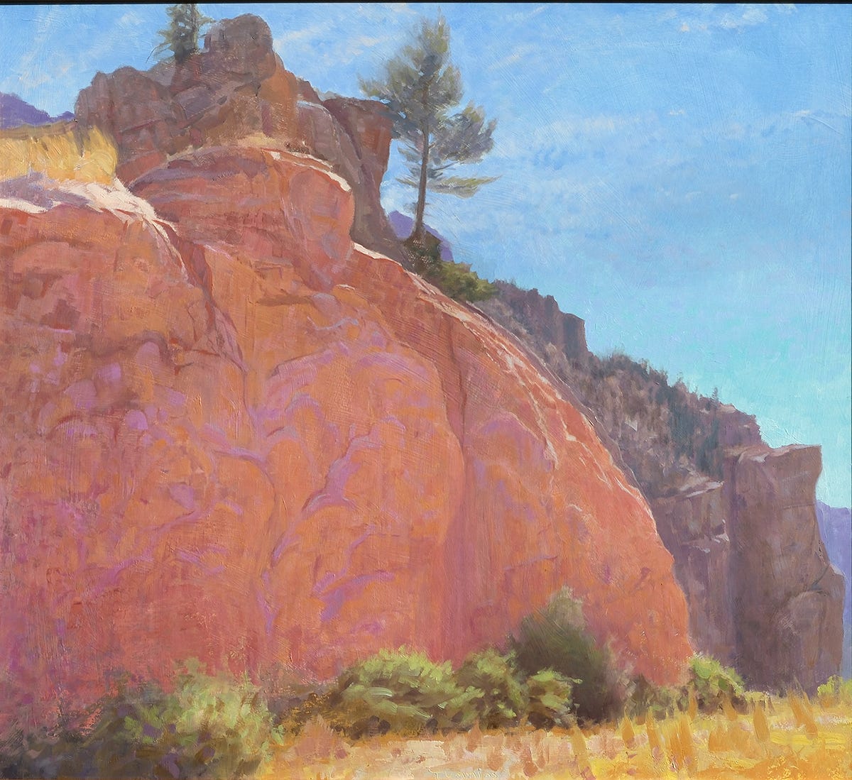 It was too much to do before a looming deadline, too many competing ideas never worked out beforehand, so I set it aside and started another, much simpler painting that I knew I could complete for the show in Denver. That painting is of a rocky cliff outside of Cody, Wyoming that is colorful and clear, a candy-like distraction that any viewer would stop for a second to view.